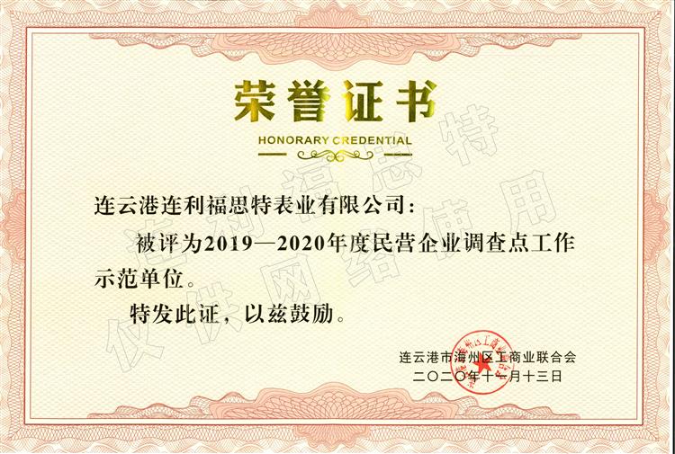 近日,連云港連利福思特表業(yè)有限公司榮獲“2019-2020年度民營企業(yè)調(diào)查點工作示范單位”稱號。 民營企...
